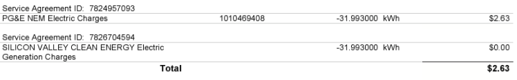 It's easy to get to low numbers if you don't take into account the number of subsidized customers, and all of the other fees that crooks at PG&E add to their pricing. Here is a more accurate picture, taken directly from my energy bill. I have solar, so I picked a month that had little "return" traffic. With apologies to those on the list who still use mutt/pine etc. But wait, there's more! This does not include the Silicon Valley Clean Energy Electric Generation Charges. So I am paying a grand total of $239.14 for 656.928 KwH of electricity. That makes 36.4 cents per KwH. It gets even better. For a month in the summer: Do you see that? My solar panels produced more power than I used, and I'm *still* paying PG&E. This (admittedly anecdotal) evidence clearly proves that the Dept of Energy's table is cherry-picked bollocks. My rate is 163% of their "average". Thanks, Sabri