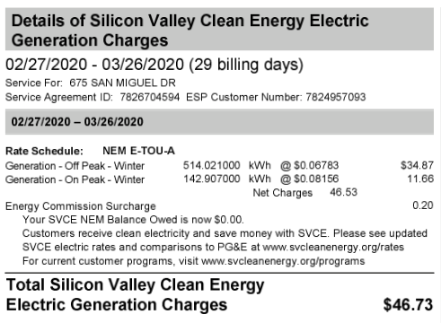 It's easy to get to low numbers if you don't take into account the number of subsidized customers, and all of the other fees that crooks at PG&E add to their pricing. Here is a more accurate picture, taken directly from my energy bill. I have solar, so I picked a month that had little "return" traffic. With apologies to those on the list who still use mutt/pine etc. But wait, there's more! This does not include the Silicon Valley Clean Energy Electric Generation Charges. So I am paying a grand total of $239.14 for 656.928 KwH of electricity. That makes 36.4 cents per KwH. It gets even better. For a month in the summer: Do you see that? My solar panels produced more power than I used, and I'm *still* paying PG&E. This (admittedly anecdotal) evidence clearly proves that the Dept of Energy's table is cherry-picked bollocks. My rate is 163% of their "average". Thanks, Sabri